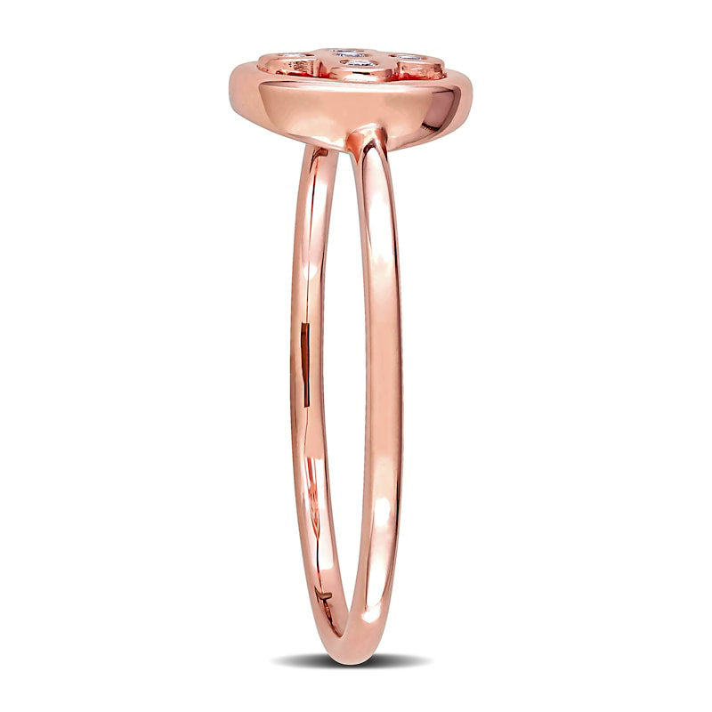This 10K rose gold diamond ring is the epitome of contemporary elegance. Showcasing a sculpted clover shape, it boasts five dazzling diamonds that are flush-set and surrounded by an open-worked round border. With a total diamond weight of 1/20 ct. t.w., this ring is radiantly beautiful and perfect for everyday wear. Its brilliant buffed luster adds the finishing touch to this modern and cleverly designed piece.
