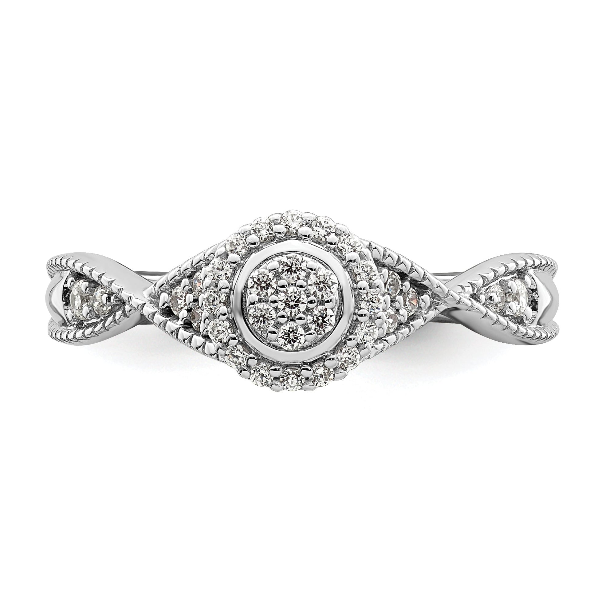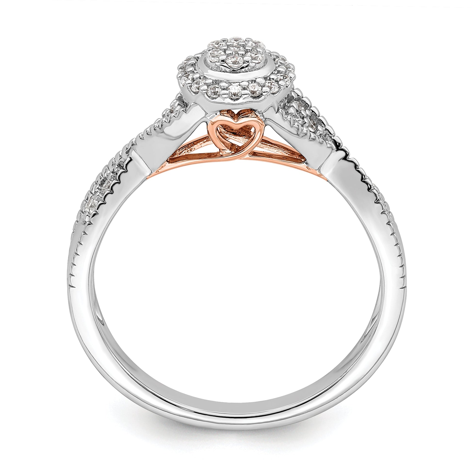 The ring features a polished finish and contains five round-cut CZ stones, with a total weight of 0.035 carats. It has an accent color of rose, a band width of 1.8 to 3.7 mm (tapered), and is set with 35 CZ stones in total. The prong-set stones range in size from 1.5 mm to 1 mm, with a total weight of 0.038 carats. The ring is complete with an open-back profile and fancy undercarriage, and is sold as a single unit.