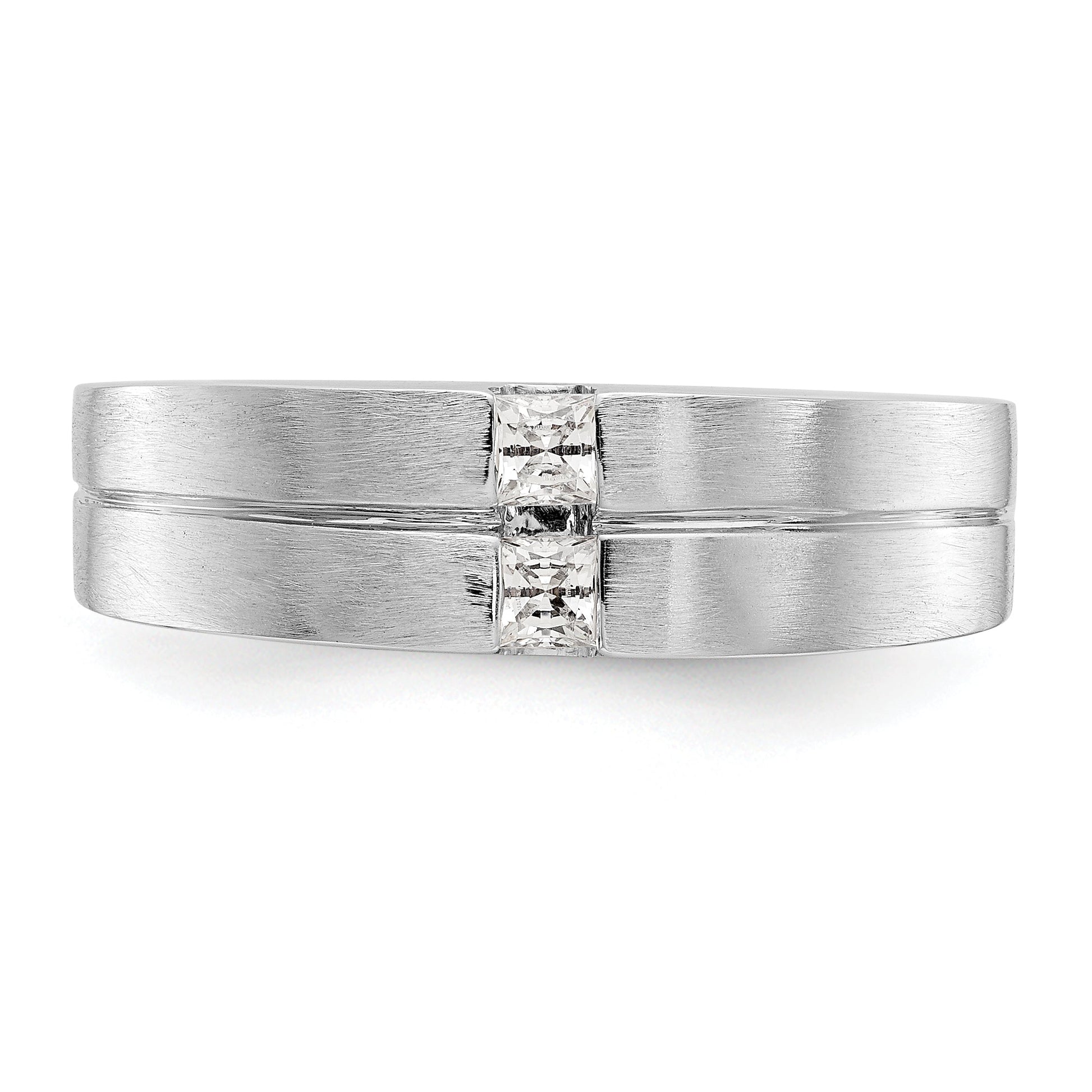 This impressive men's wedding band ring features two beautiful square AAA quality cubic zirconia stones, each weighing 0.13ct. The stones are hand-set and high polished in a solid setting by our experienced jewelers. The band has a tapered design, measuring 6.9mm at its widest point and 4.4mm at its narrowest. It is made with exceptional quality craftsmanship and stamped with authenticity. Customize this ring by choosing between white, yellow, and rose gold finishes. This ring can also be upgraded to feature natural diamonds upon request. It's the perfect gift for any special occasion, including birthdays, anniversaries, engagements, graduations, bridal parties, Mother's Day, Valentine's Day, Christmas, or just to say "I love you." It even comes ready to gift with a complimentary gift box. Your purchase is accompanied by a 30 day, hassle-free, money-back guarantee, and exceptional customer service from our USA based company.