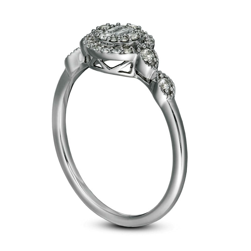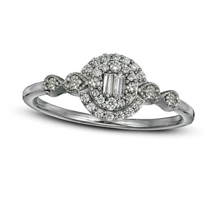 Embodying timeless elegance, this diamond ring boasts a vintage-inspired design that will make her heart skip a beat. Meticulously crafted from lustrous 10K white gold, the ring showcases a dazzling composite of round and baguette-cut diamonds, artfully nestled within a chic round-diamond frame. The shank is adorned with diamonds that shine like teardrops, embellished with intricate milgrain detailing. Boasting a total diamond weight of 1/4 ct. and a brilliant buffed luster, this ring radiates sophistication and complements any style with grace and charm.