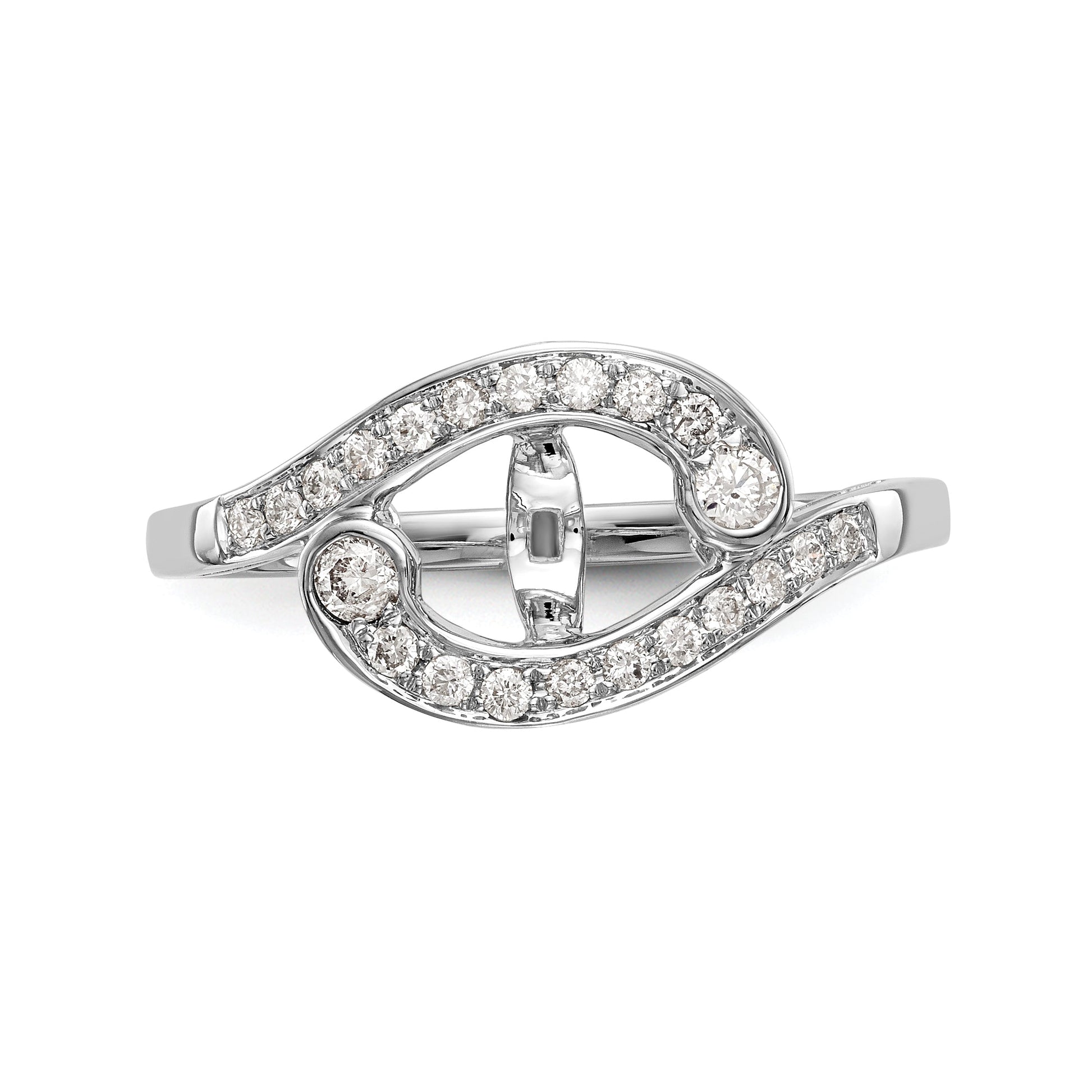 The ring is semi-mount so the center stone is not included. It features a head type peg set and an open back. Stones are round-shaped with sizes ranging from 6.5mm to 1.1mm. The ring is sizeable between 6 and 8 with increments of 0.25. The band width is tapered between 1.5mm and 1.9mm. The thickness of the ring is less than 1.5mm. The ring features a combination of natural diamonds and synthetic cubic zirconia, all of which are set in solid 14k white gold.