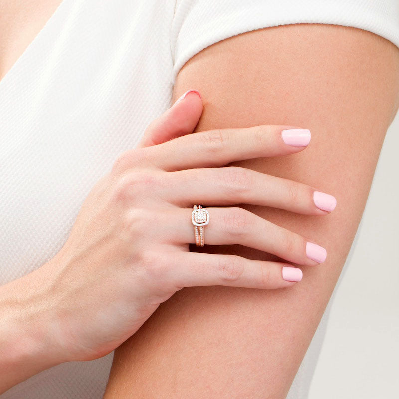 This stunning diamond bridal set is certain to capture her heart with its vintage-inspired design. Created using precious 10K rose gold, the engagement ring showcases a square diamond composite that is enveloped by two cushion-shaped diamond halo frames. The shank is adorned with gorgeous diamonds and intricate milgrain detailing that adds a touch of old-world charm. On the day of your wedding, the coordinating diamond and milgrain band beautifully completes the ensemble. With a total diamond weight of 1/3 ct. t.w. and a radiant buffed luster, this comfort-fit bridal set will undoubtedly become a cherished possession.