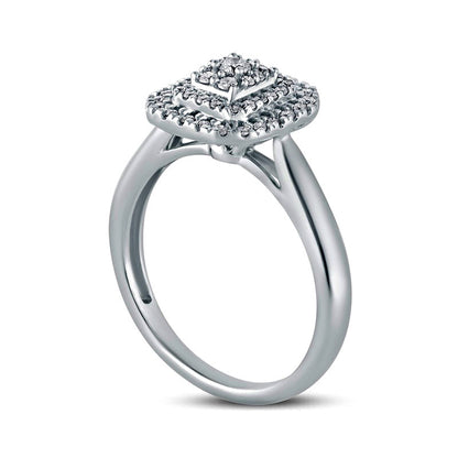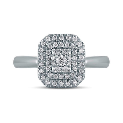 This stunning diamond engagement ring is the perfect way to show your love. Made with high quality 10K white gold, it boasts a striking octagonal composite of diamonds at its center, with the largest stone measuring 1/20 ct. The central diamonds are further enhanced by a beautifully designed double frame of additional diamonds, creating an mesmerizing sparkle. With an impressive total weight of 1/3 ct. and a shiny polished finish, this engagement ring is a true symbol of your affection. Get ready for an unforgettable proposal with this incredible ring.