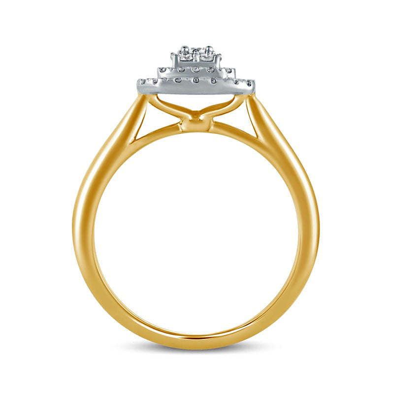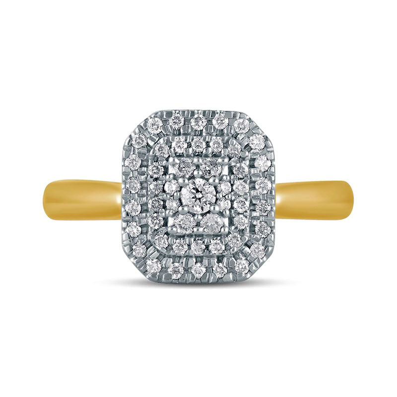 This stunning diamond engagement ring is sure to capture the heart of your beloved. Made with high-quality 14K gold, this ring features a striking octagonal composite of diamonds, including a dazzling 1/20 ct. stone. Surrounding the center are two frames of diamonds that add incredible sparkle to the piece. With a total weight of 1/3 ct. t.w., this ring is an exquisite symbol of your love and commitment. Shining brightly with a polished finish, it will make a lasting impression.