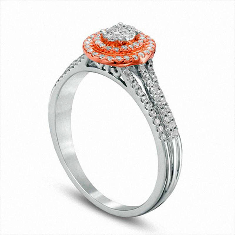 This stunning diamond engagement ring will capture her heart with its dazzling beauty. Expertly crafted in 10K two-tone gold, this ring boasts an oval, diamond-lined composite centerpiece in white gold, encircled by a double frame of sparkling diamonds in rose gold. The split shank in white gold is elegantly embellished with three ribbons of diamonds, completing the enchanting design. With a total weight of 1/3 ct. t.w., this ring exudes brilliance and radiance from every angle. A truly breathtaking piece that she will treasure forever.