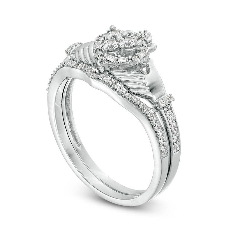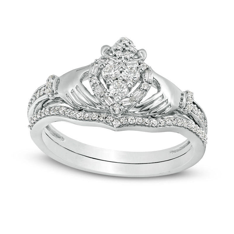 This elegant diamond claddagh bridal set is a beautiful symbol of your love and devotion. Crafted from lustrous 10K white gold, the engagement ring boasts a heart-shaped frame of round and baguette-cut diamonds that encloses a trio of sparkling diamonds, crowned with diamond accents and flanked by polished hands. The band is also adorned with shimmering diamonds, completing the perfect match. With a total weight of 1/3 ct. t.w. and a dazzling finish, this bridal set is a radiant expression of your friendship and commitment.