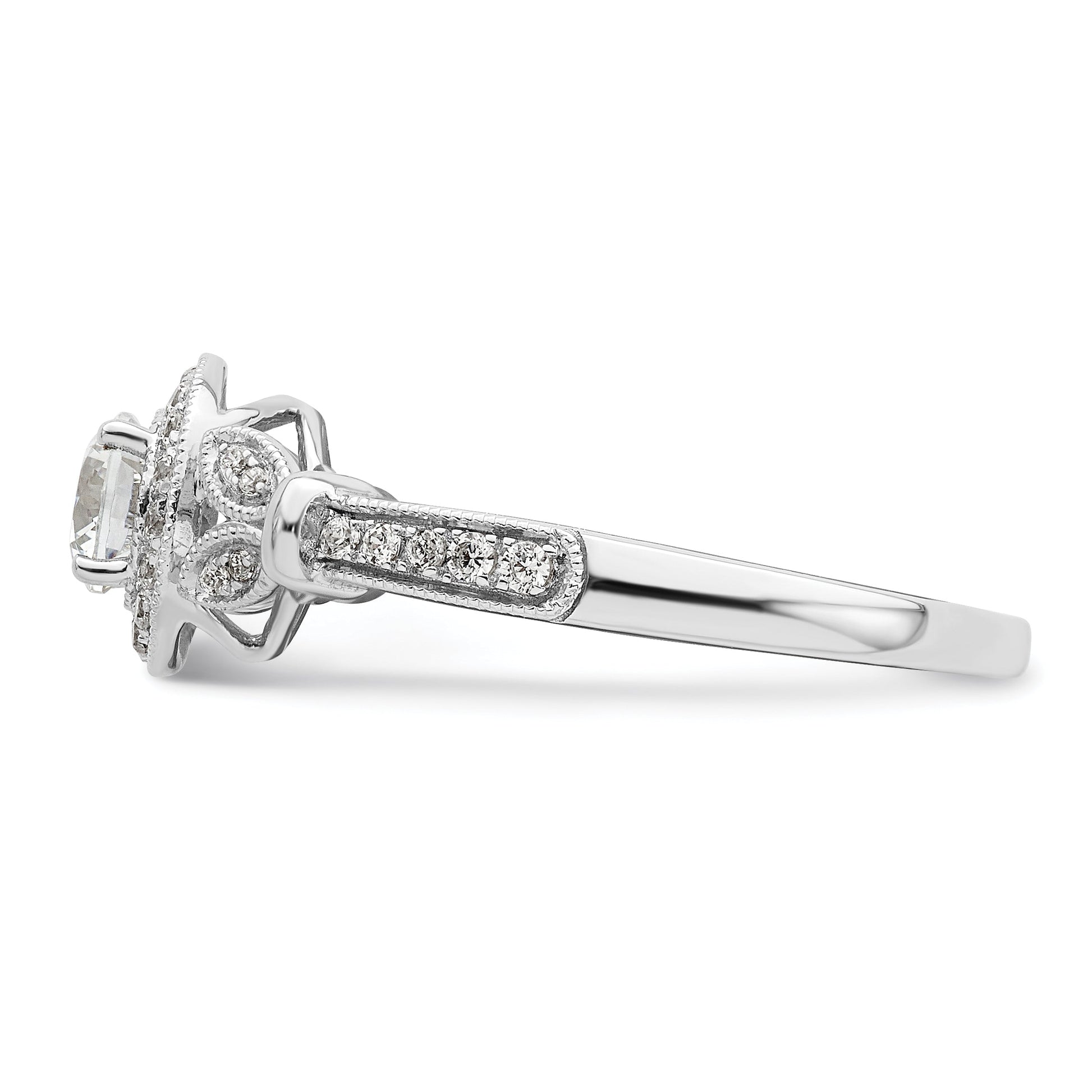 This engagement ring is made of real 14K white gold and features a 0.40 carat AAA quality cubic zirconia stone in a vintage round halo design. The ring can also be crafted in solid yellow or rose gold at no extra cost, and is stamped with 14K for authenticity. The CZ stone is securely hand-set in a polished gold setting by experienced jewelers. If requested, the ring can be upgraded with natural diamonds for an additional cost. This beautiful piece of jewelry arrives in a complimentary gift box and makes for a special gift for any occasion, from birthdays to engagements. The 30-day, hassle-free, money-back guarantee ensures customer satisfaction. The ring's band width is adjustable and features tapering from 1.5 to 4.4mm. The stones are prong-set and range in size from 4.8mm to 0.8mm. This is the perfect alternative to natural diamonds and ensures a peaceful vacation ring. The ring's profile type is open back and the head type is round with four prongs.
