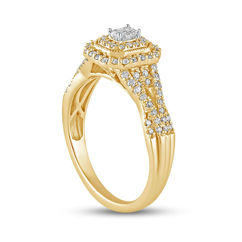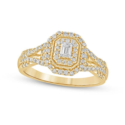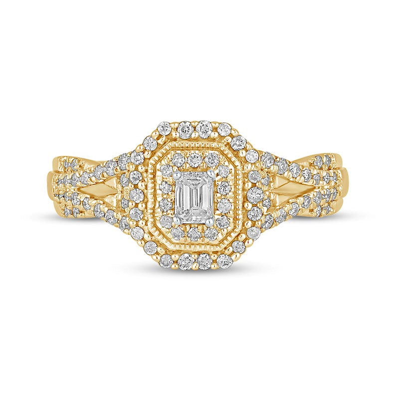 The 1/2 CT. T.W. Emerald-Cut Diamond Frame Vintage-Style Multi-Row Engagement Ring in 10K Gold exudes a romantic aura that'll make any heart flutter. The warm 10K gold adds to its vintage appeal, while the 1/8 ct. emerald-cut diamond at the center is encircled by a double octagonal frame of diamonds with intricate milgrain detailing. The multi-row split shank makes it even more enchanting, with crossed diamond ribbons that further elevate its sparkle. With 1/2 ct. t.w. of diamonds and a lustrous, polished shine, this engagement ring is an exquisite symbol of your unwavering love.