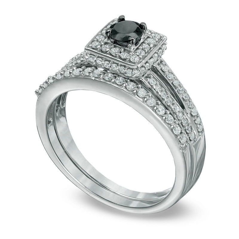 Get ready for an enchanting moment with our stunning diamond bridal set. Crafted with care, the engagement ring is crafted in sterling silver and features a remarkable 1/8 ct. enhanced black diamond center stone. The gem is elegantly bordered with a square frame of delicate round accent diamonds, with additional accent diamonds gracing the ring's split shank. The coordinated diamond-lined wedding band adds the finishing touch to this exquisite ensemble. With a total diamond weight of 1/2 ct. t.w., this bridal set shines bright with a polished finish. This ring is custom-made to fit her ring size and cannot be resized after purchase. Dream big on your special day with this magnificent bridal set.