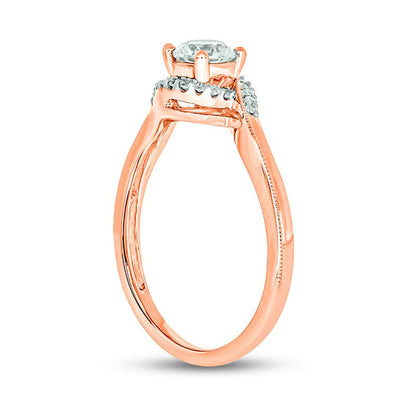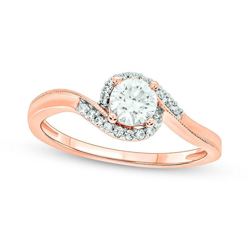 This 14K rose gold diamond engagement ring is a perfect blend of modern and vintage-inspired style. Featuring a dazzling 3/8 ct. diamond at the center, the bypassing ribbons are adorned with shimmering diamonds and intricate milgrain borders along the inside edges. With a total weight of 1/2 ct. t.w. of diamonds and a radiant polished finish, this engagement ring is a stunning symbol of love and commitment. It's the perfect way to start your love story and capture the heart of the one you love.