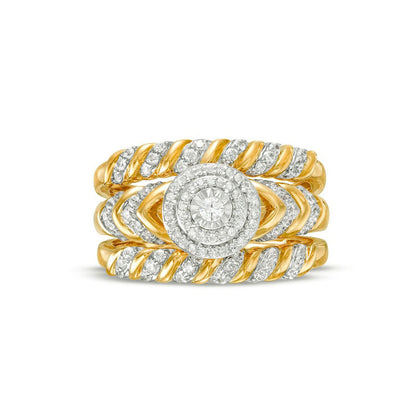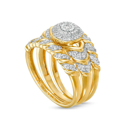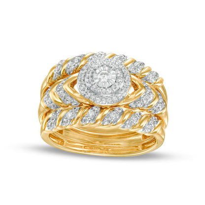 0.50 CT. T.W. Natural Diamond Double Frame Spiral Three Piece Bridal Engagement Ring Set in Solid 10K Yellow Gold (J/I3)