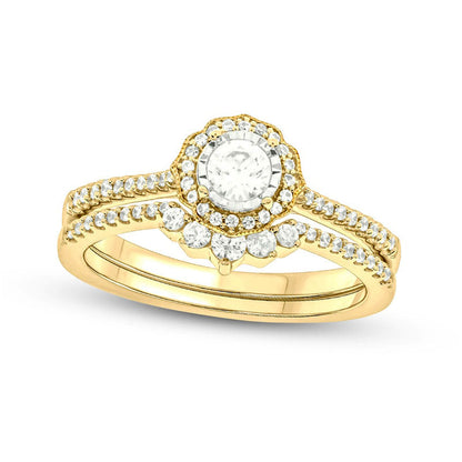This stunning diamond bridal set combines vintage aesthetic with modern elegance. Crafted from lustrous 10K gold, the engagement ring features a dazzling 1/6 ct. diamond that is expertly set to maximize its shine and size. The intricate floral frame and shank are adorned with additional shimmering diamonds that add to the timeless allure of the piece. The accompanying wedding band is equally exquisite, showcasing multi-sized diamonds that are perfectly contoured to fit with the engagement ring. Delicately tapered diamonds along the graceful shank complete this matchless set, which boasts a total of 1/2 ct. t.w. of diamonds. With its radiant polished finish, this bridal set is an unforgettable expression of your love.