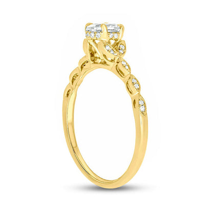 This traditional engagement ring is made from 10K gold and has a vintage style. It features a sparkling oval-shaped diamond in the center and more diamonds around it. The ring also has leaf shapes with small diamonds on each side. The total diamond weight is 1/2 ct. This beautiful ring is perfect for expressing your love and devotion.