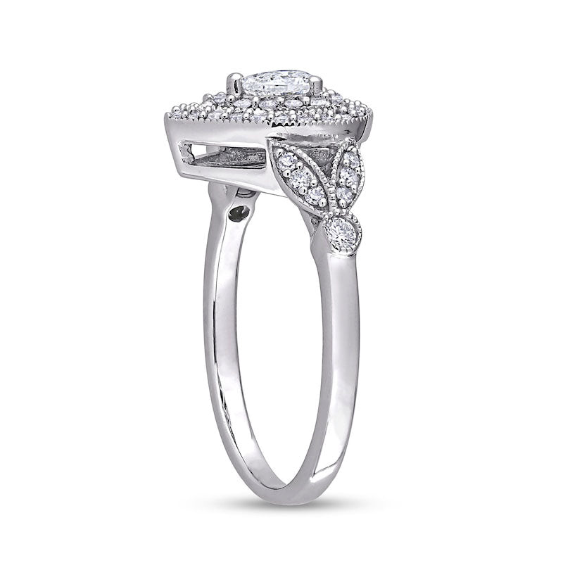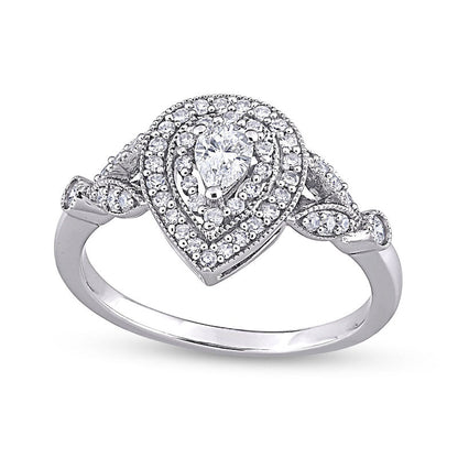 0.50 CT. T.W. Pear-Shaped Natural Diamond Double Frame Leaf-Sides Antique Vintage-Style Engagement Ring in Solid 10K White Gold