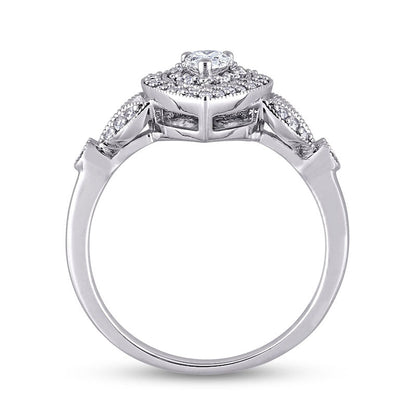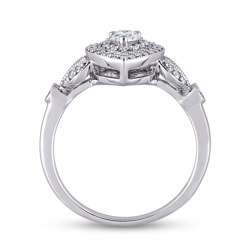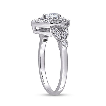 Looking for a unique and exquisite engagement ring that will make your special moment truly unforgettable? Look no further than this stunning vintage-style diamond ring. Made from 10K white gold, this breathtaking ring features a captivating 1/5 ct. pear-shaped diamond nestled within an intricate halo of diamonds. Delicate leaf shapes add a touch of nature-inspired charm, while milgrain detailing adds vintage appeal. With a total of 1/2 ct. t.w. of dazzling diamonds and a brilliant polished finish, this ring radiates beauty and elegance. Perfect for anyone looking for a truly special engagement ring!