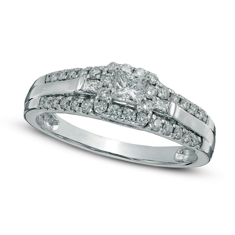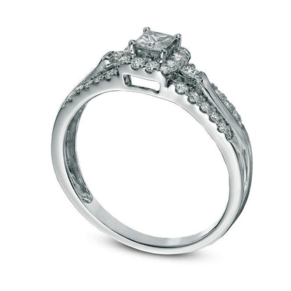 Revel in the bold beauty and contemporary design of this stunning diamond engagement ring. Expertly crafted in 10K white gold, the ring showcases a brilliant 1/6 ct. princess-cut diamond at its center. A square-shaped frame of smaller round accent diamonds surrounds the center stone, while additional diamonds line the ring's shank at the top and bottom, creating an enchanting, sparkling effect that envelops the centerpiece in a magnificent embrace. The ring is adorned with a total of 1/2 ct. t.w. of dazzling diamonds, making it an unmistakable symbol of your love and commitment to a bright future together. With a polished and gleaming finish, this ring is a perfect representation of the joy and excitement of this once-in-a-lifetime moment.
