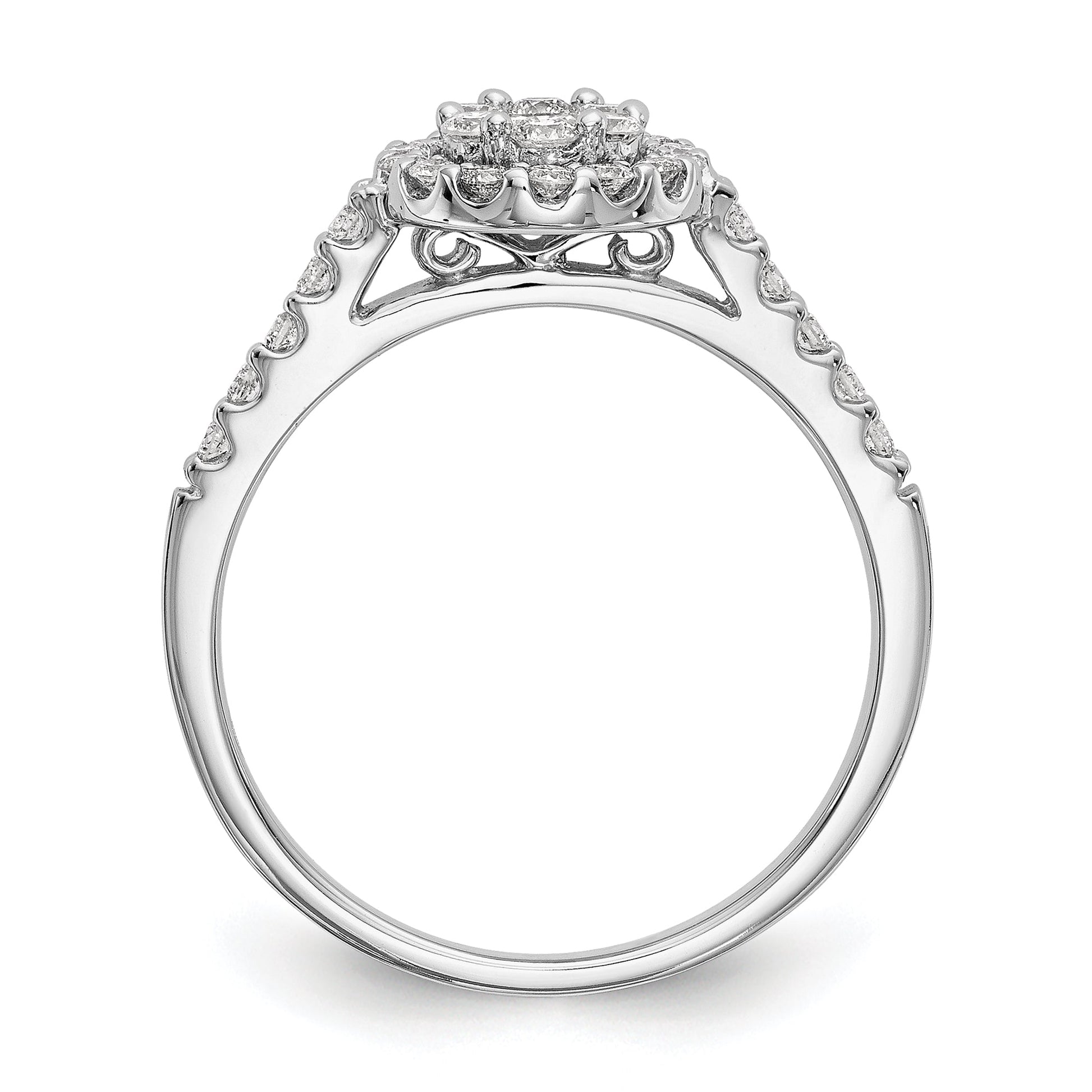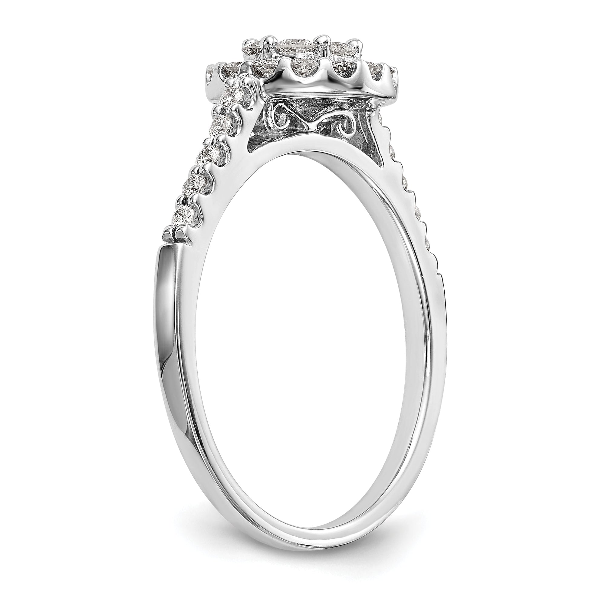 Manufactured through casting process, the ring boasts a polished finish and rhodium plating to enhance its shine. This closed-back jewelry is designed for women and is sold individually. It is created using synthetic materials, including the four round-cut CZ stones of varying sizes which have a total weight of 0.11 ct. Stone clarity is AA and features stone creation method is synthetic.