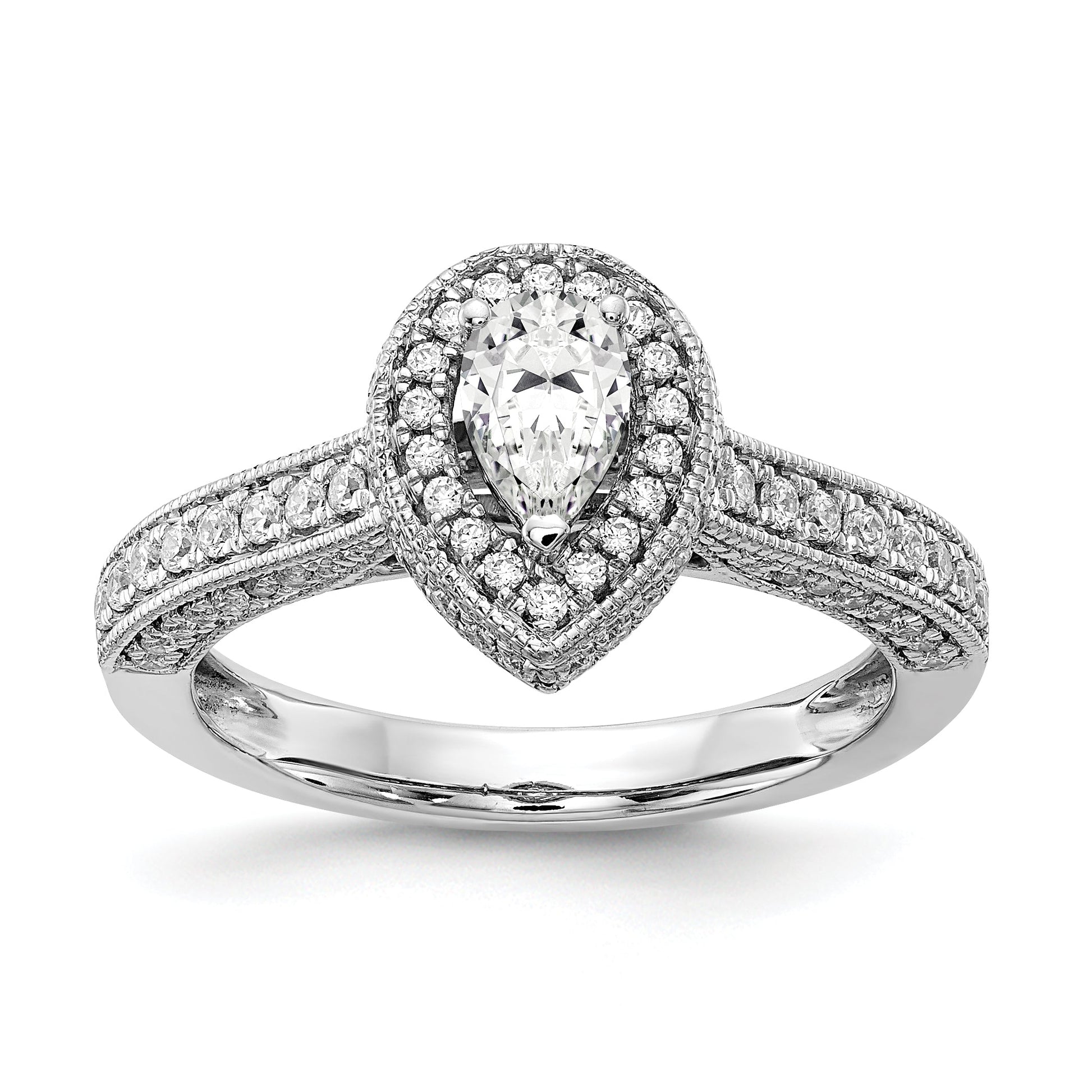 This stunning engagement ring boasts a 0.50ct AAA quality cubic zirconia set in a solid 14k white gold pear halo design. The high-polished setting is crafted by experienced jewelers and stamped with 14K for authenticity and exceptional quality. The ring is also available in solid 14k yellow or rose gold at no extra cost. Upgrade to natural diamonds is available upon request. The ring arrives ready to gift in a complimentary giftbox, making it an ideal present for birthdays, anniversaries, weddings, engagements, and other special occasions. With a 30-day money-back guarantee, you can rest assured of your satisfaction. Its timeless design also makes it the perfect vacation-safe or everyday ring.