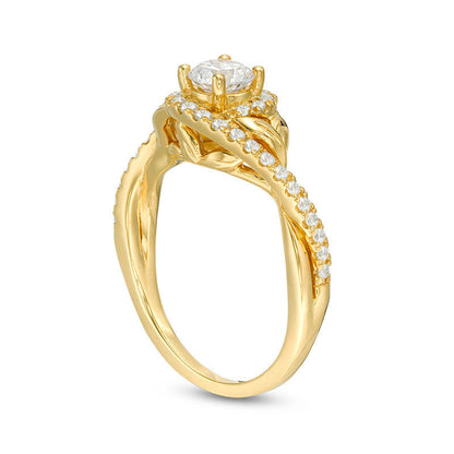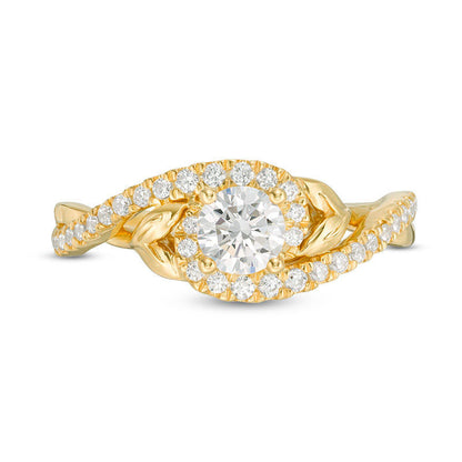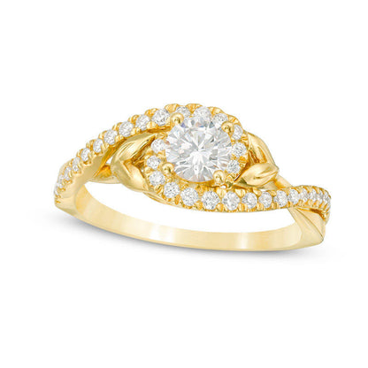 Propose to your beloved with this stunning diamond engagement ring, which is bound to take their breath away. The nature-inspired design is crafted from 14K gold and features a mesmerizing 1/2 ct. diamond at its center. The shank boasts two diamond-lined bands that gracefully bypass one another and are adorned with charming sculpted leaf accents. The polished ribbons of the shank brilliantly showcase the shimmering diamonds, totaling 3/4 ct. t.w. This engagement ring is the perfect embodiment of your fairy-tale romance and will continue to dazzle for years to come.
