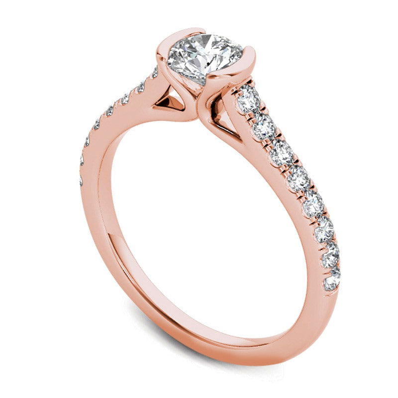 Looking for a stunning diamond engagement ring that’s both modern and elegant? Look no further than this beautiful piece, crafted from high-quality 14K rose gold. Featuring a unique half-bezel setting that highlights a dazzling 3/8 ct. round diamond center stone, this ring is an exquisite choice for a sophisticated bride. The tapered shank is adorned with smaller round accent diamonds that graduate in size, adding the perfect finishing touch to this contemporary design. With a total diamond weight of 3/4 ct. and a polished shine that catches the eye, this engagement ring is sure to captivate her heart.