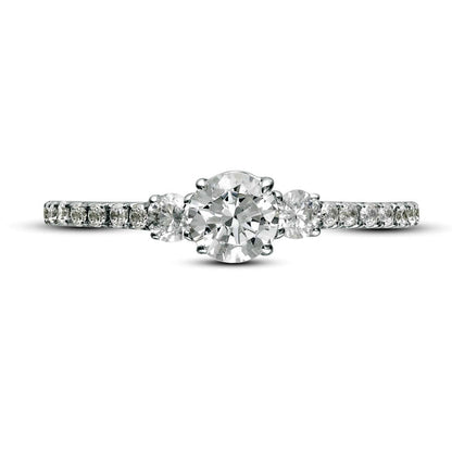 Capture her heart forever with the everlasting elegance of this diamond engagement ring. Crafted in 14K white gold, the ring flaunts a three-stone design showcasing a gorgeous 3/8 ct. diamond at the center, flanked by 1/15 ct. diamonds on either side. The slender shank of the ring is also adorned with sparkling diamonds to add more opulence to the piece. With a total of 3/4 ct. t.w. of diamonds and a remarkable shine, this engagement ring is the embodiment of everlasting love and enduring beauty. Make it hers and cherish your love story forever.