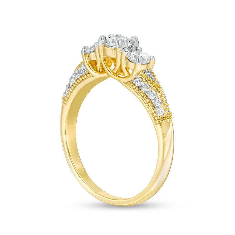 Begin your journey together with a captivating vintage-style diamond engagement ring. Meticulously crafted using 10K gold, this enchanting piece showcases a glimmering 1/4 ct. diamond nestled between two 1/8 ct. diamonds. Adorning the band, charming "V" shaped designs, bordered by delicate milgrain, are adorned with petite diamonds. Boasting a total diamond weight of 3/4 ct. and a brilliant polished finish, this elegant three-stone engagement ring symbolizes your eternal bond.
