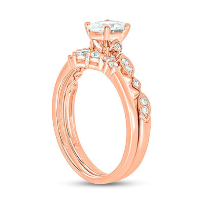 Celebrate your love with this stunning vintage-style diamond bridal set. Crafted in 14K rose gold, the engagement ring features a gorgeous 1/2 ct. oval-shaped diamond as its centerpiece. The shank is embellished with diamond-accented marquise shapes and round frames, all complemented by intricate milgrain detailing. The accompanying contoured wedding band is adorned with a striking marquise-cut diamond at its center, surrounded by graduated-size round diamonds for an elegant touch. This exquisite bridal set features a total diamond weight of 3/4 ct. and is polished to a radiant shine, making it the perfect symbol of your love and commitment.