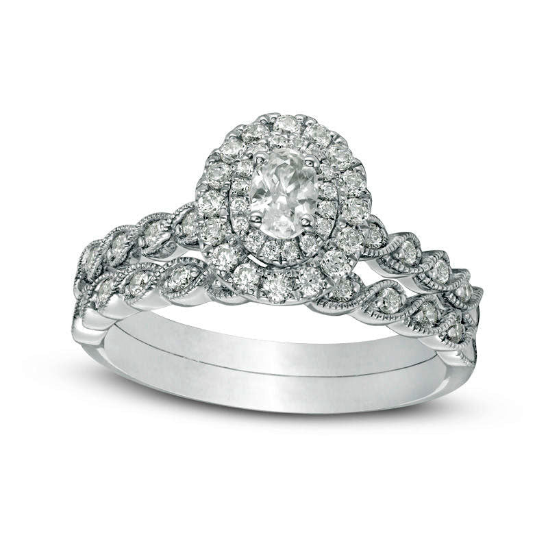 Introducing a stunning vintage-inspired diamond bridal set that will forever seal your commitment to your true love. Meticulously crafted in 14K white gold, the engagement ring boasts a remarkable 1/4 ct. oval-cut diamond encircled by a double frame of glittering diamonds. The shank features a delicate twist with intricate milgrain detailing that showcases even more shimmering diamonds. On your wedding day, the coordinating diamond and milgrain twist shank adds to the classic and timeless appeal of the set. Sparkling with a total of 3/4 ct. t.w. of diamonds, and with a remarkable brilliance that catches the light from all angles, this stunning bridal set represents your beautiful and everlasting love story.