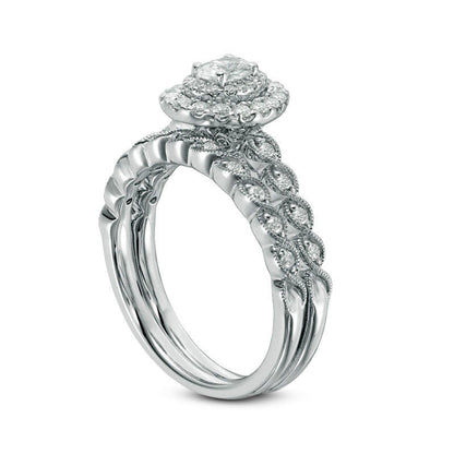 0.75 CT. T.W. Oval Natural Diamond Double Frame Twist Antique Vintage-Style Bridal Engagement Ring Set in Solid 14K White Gold