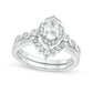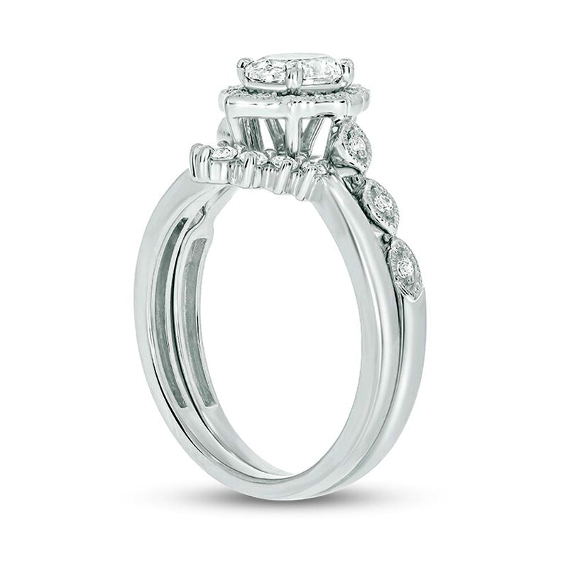 Adorn your beloved with a stunning and sentimental piece that captures the essence of your devotion. Presenting an elegant and vintage-style diamond bridal set crafted in lustrous 14K white gold. The engagement ring features a breathtaking 1/2 ct. oval diamond set in a beautiful quatrefoil shaped frame, encircled by a halo of sparkling diamonds and intricate milgrain detailing. The shank is adorned with may lovely marquise-shaped diamonds and bordered by milgrain detailing, adding an extra touch of opulence. On the day of your wedding, the marvelous wedding band, contoured to perfectly compliment the engagement ring, explodes with a burst of sparkling diamonds. This beautiful statement piece boasts a total diamond weight of 3/4 ct. and is finished with a radiant and shiny polish, making it the perfect fit for your sophisticated bride.
