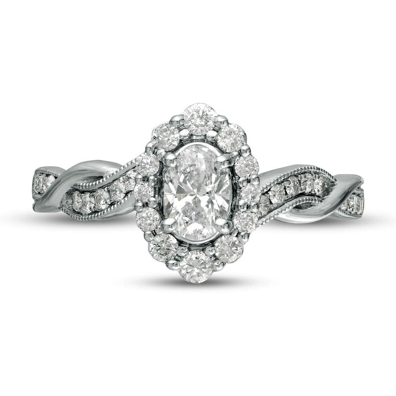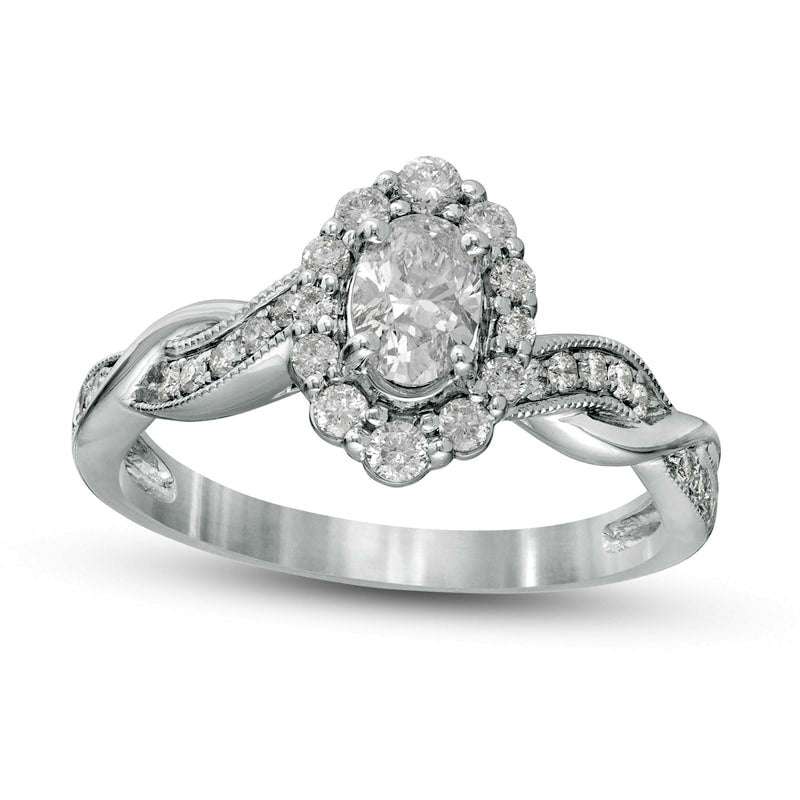 Celebrate the start of your forever with the stunning vintage charm of this diamond engagement ring. The blissful design combines 10K white gold with 3/4 ct. t.w. of diamonds to create a mesmerizingly beautiful piece. At its heart lies a captivating oval-shaped 3/8 ct. diamond, encircled by a frame of sparkling round diamonds in various sizes. The twist shank of this ring is adorned with rows of shimmering diamonds and polished ribbons, bordered with intricately crafted milgrain details. A symbol of your devotion, this engagement ring exudes a glorious sparkle and a truly remarkable brilliance.