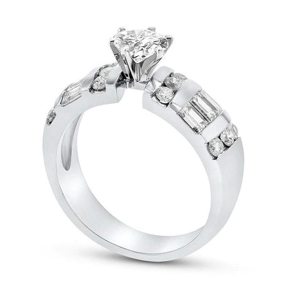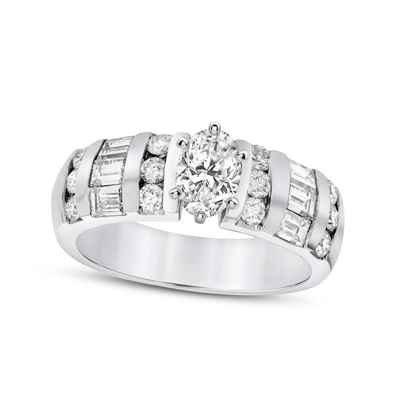 This 14K white gold engagement ring is a perfect fit for the modern bride. The centerpiece of the chic design is a 1/2 ct. oval-cut diamond, ranked G in color and SI2 in clarity, elegantly displayed in a six-prong setting. The wide shank dazzles with alternating rows of channel-set and baguette-cut diamonds. In total, this engagement ring boasts a remarkable 1-3/8 cts. t.w. of diamonds, assuring a brilliant sparkle that will last a lifetime. A beautiful symbol of love, this engagement ring is sure to bring joy to any bride.