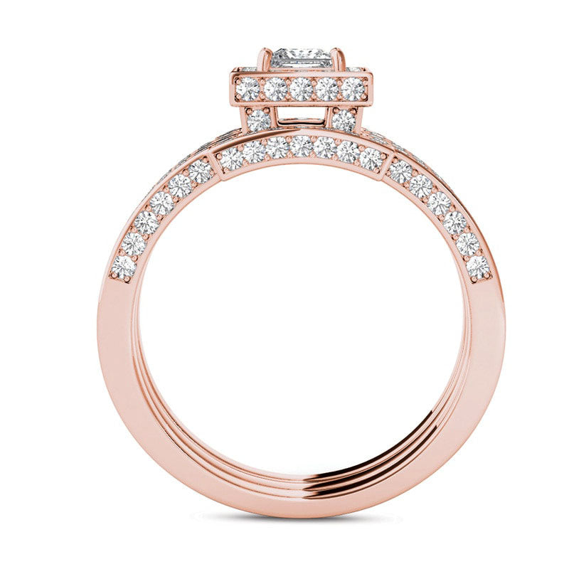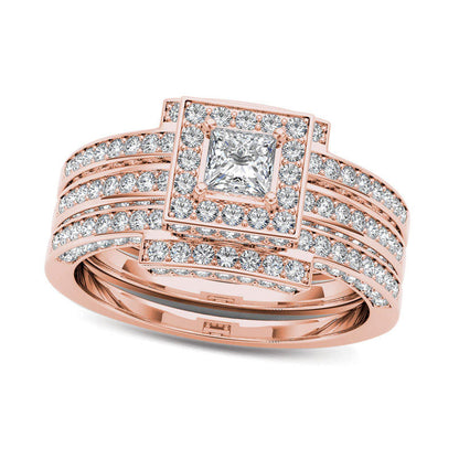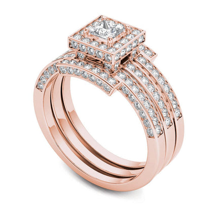 1.38 CT. T.W. Princess-Cut Natural Diamond Frame Three Piece Bridal Engagement Ring Set in Solid 14K Rose Gold