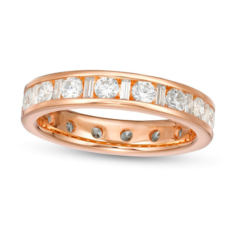 Celebrate your everlasting love with this stunning diamond eternity wedding band. Crafted in 14K rose gold, this contemporary design showcases an exquisite combination of baguette-cut and round diamonds, totaling 1-1/2 cts. t.w. The diamonds are skillfully set in a continuous channel, creating an elegant and stylish effect. The band has a comfortable fit for daily wear and a brilliant, polished finish. Express your undying commitment with this breathtaking wedding band, and start your journey towards a brilliant future together.