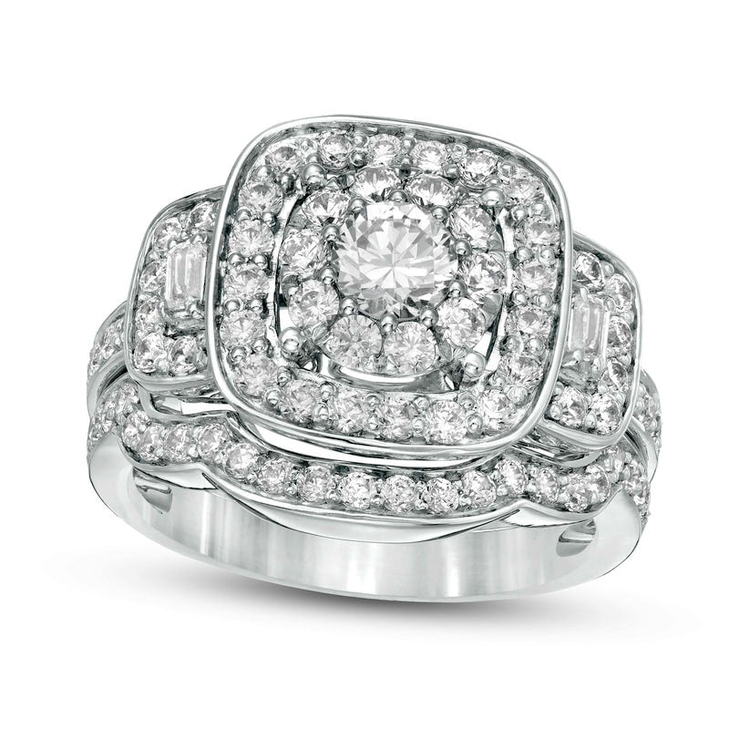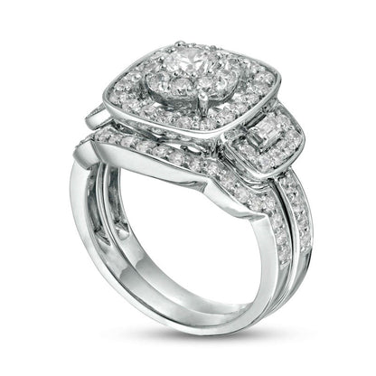 Looking for a stunning way to mark your love? Look no further than this remarkable diamond bridal set, which celebrates your next chapter together in unforgettable style. Fashioned in sleek 10K white gold, the three-stone engagement ring features a sparkling 1/3 ct. diamond enveloped by a dazzling diamond halo and framed with a cushion of diamonds. Flanking the center are glittering baguette-cut diamonds set within round-frames of diamonds, while additional diamonds grace the shank. On your big day, give her the curvaceous diamond-lined band for a fitting finishing touch. With a total weight of 1-5/8 cts. t.w. and a luminous polished finish, this bridal set is the ultimate symbol of your love and devotion.