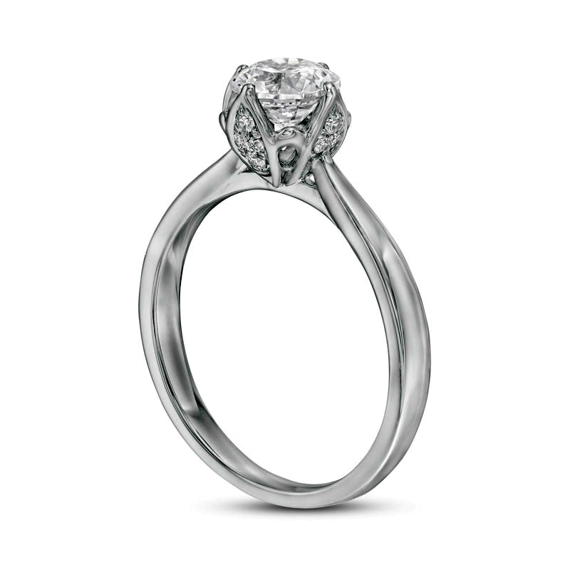 This is a gorgeous 14K white gold engagement ring with a flower-inspired setting, featuring a certified 1 carat diamond with a grade of I for color and I2 for clarity. The setting is studded with additional diamonds, and the ring is made to be comfortable for everyday wear. The ring comes with a certificate that has a photo and description of the diamond, and can be used for insurance purposes. It's a stunning and elegant choice for your special someone.