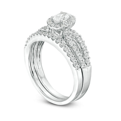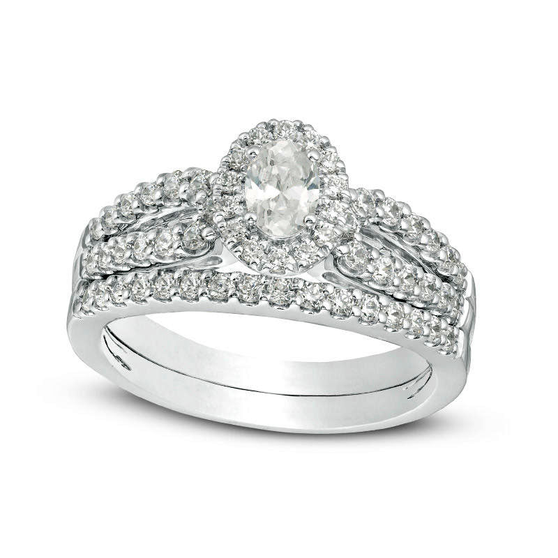 Celebrate your love with this stunning 14K white gold bridal set featuring a certified oval cut 1/3 ct. diamond at the center of a halo frame of diamonds. The curved split shank is also adorned with additional diamonds for extra sparkle. On your wedding day, the accompanying diamond-lined wedding band will complete your bridal look. Each of the diamonds in this set are certified with a color rank of I and clarity of I1, totaling 1 ct. t.w. The set exudes elegance with a brilliant buffed luster, making it a beautiful representation of your commitment to one another. You'll receive a certificate with a photo and description of the diamond, providing assurance of its quality and a useful reference for insurance purposes. Let this bridal set remind your partner that they are the light of your life.