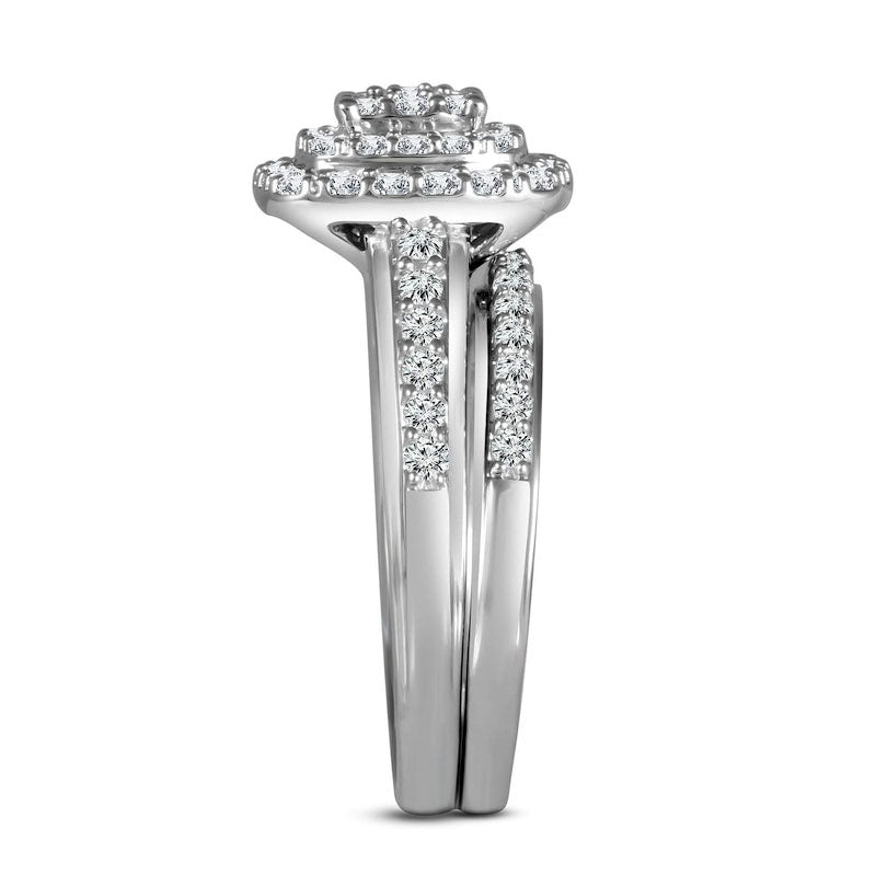 Completing the ensemble, the accompanying wedding band is equally mesmerizing, boasting a captivating array of diamonds that add to its radiant charm. Together, this bridal set sparkles with an impressive 1 ct. t.w. of diamonds and radiates with a brilliant polished shine, making it an unforgettable selection for your cherished soulmate.