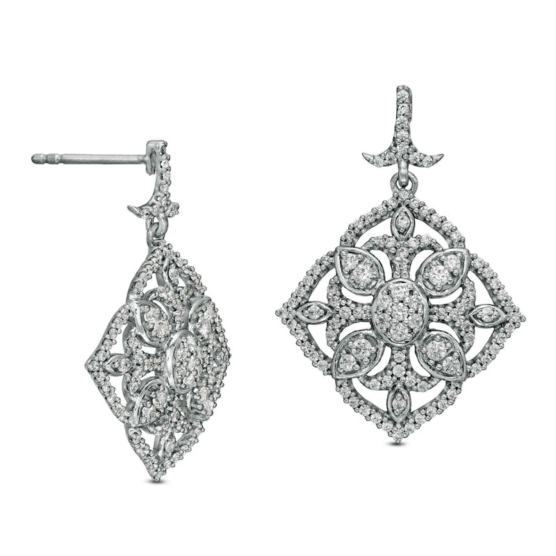1 CT. T.W. Diamond Ornate Flower Vintage-Style Drop Earrings in 10K White Gold