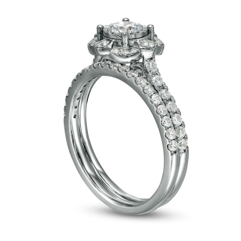 This elegant bridal set is filled with sparkle and love. It is made of 10K white gold and has a gorgeous engagement ring with a 1/3 carat diamond surrounded by smaller diamonds in a floral design. The diamond-lined band adds even more shimmer to the set. With a total of 1 carat of diamonds, this set is a perfect symbol of your love and future together.