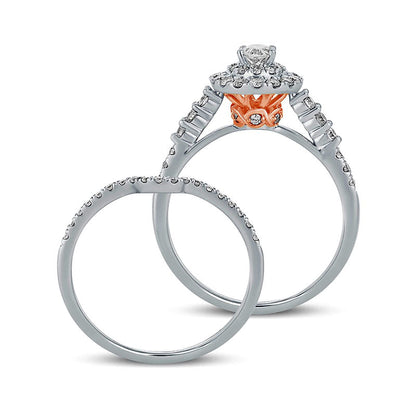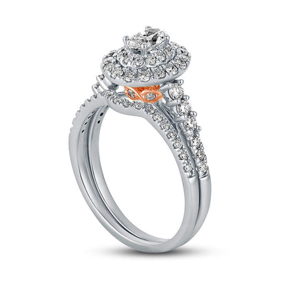 Indulge in the mesmerizing allure of this stunning diamond bridal set that radiates pure elegance and romance. This alluring set is meticulously crafted in exquisite 10K white gold and features a captivating 1/3 ct. oval-shaped diamond embraced by a double frame adorned with a lustrous array of diamonds. The shank is embellished with graduated diamonds while the hidden 10K rose gold crown detail glitters with diamonds. The contoured diamond-lined wedding band adds to the charm of this bridal set and seals your vows on your special day. With a brilliant 1 ct. t.w. of diamonds and an awe-inspiring polished luster, this bridal set is a true reflection of the captivating beauty of your love.