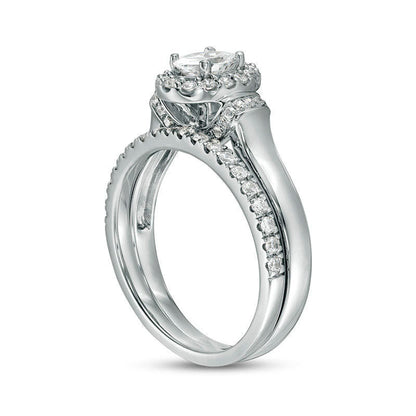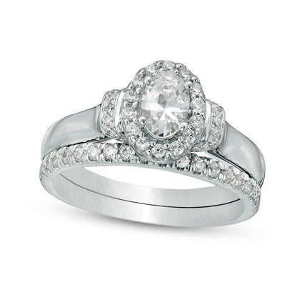 Experience the ultimate symbol of devotion with this stunning diamond bridal set. Created from lustrous 14K white gold, the elegant engagement ring features a brilliant 1/2 ct. oval-shaped diamond enveloped by a glistening halo of round diamonds, complemented by diamond-studded collars on either side. To make your special day even more unforgettable, adorn your beloved's finger with the corresponding band, adorned with a seamless row of diamonds. Boasting a magnificent 1 ct. t.w. of diamonds and a flawless polished finish, this bridal set is a timeless tribute to your enduring love.
