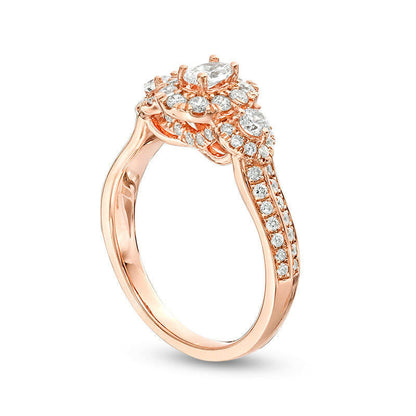 1.0 CT. T.W. Oval Natural Diamond Frame Three Stone Double Row Engagement Ring in Solid 14K Rose Gold