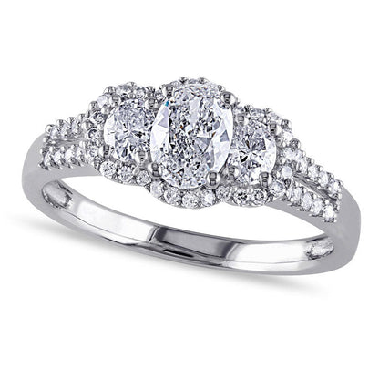 Introducing an exquisite and unparalleled diamond engagement ring that is guaranteed to leave her spellbound. Crafted with pure 14K white gold, this ring boasts a triple set of luminous oval-shaped diamonds at the center, with the largest stone weighing an impressive 1/2 ct. Smaller accent diamonds are artfully placed in oval-shaped frames that encircle each of the center stones. The band is also meticulously embellished with dazzling diamonds, making it truly breathtaking. With a total diamond weight of 1 ct. t.w., this ring is a generous symbol of love that will radiate on your loved one's finger. Shining with a bright polished finish, this ring is one of a kind and timeless.