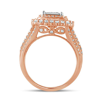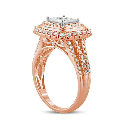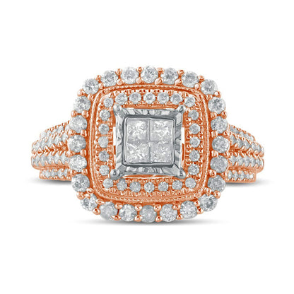 1.0 CT. T.W. Princess-Cut Quad Natural Diamond Double Square Frame Antique Vintage-Style Engagement Ring in Solid 10K Rose Gold