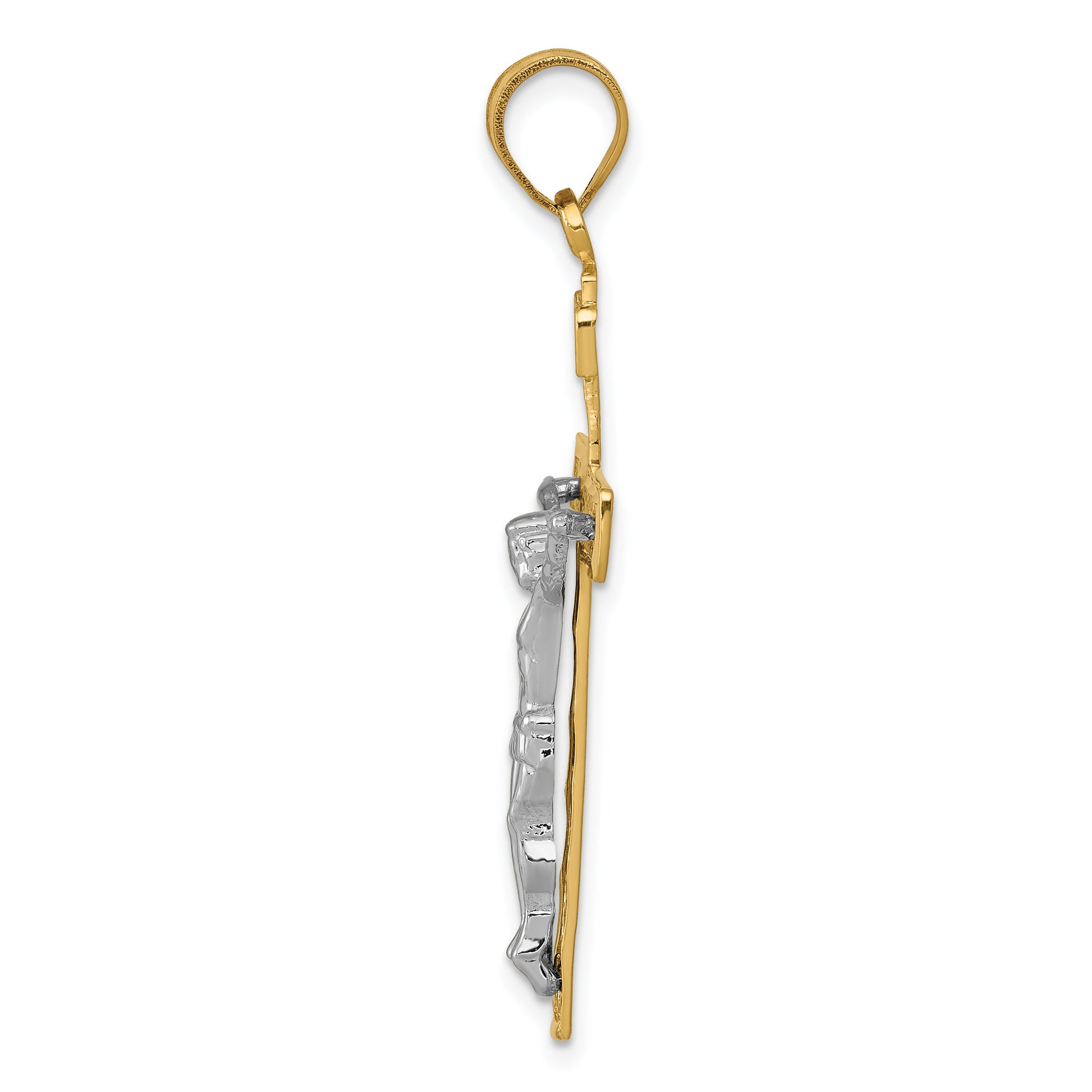 Introducing our exquisite 10K Two-Tone D/C Large Block Lattice Cross with Crucifix Pendant. Crafted from 10K gold, this pendant shines with a polished finish that adds a touch of elegance to any look. Its two-tone style offers a modern twist to a classic design, making it a timeless piece in your jewelry collection. Measuring 42mm in length and 21mm in width, this solid pendant captivates with its detailed latticework and crucifix, ideal for everyday wear or special occasions. Elevate your style with the exquisite 10K Two-Tone D/C Large Block Lattice Cross with Crucifix Pendant.