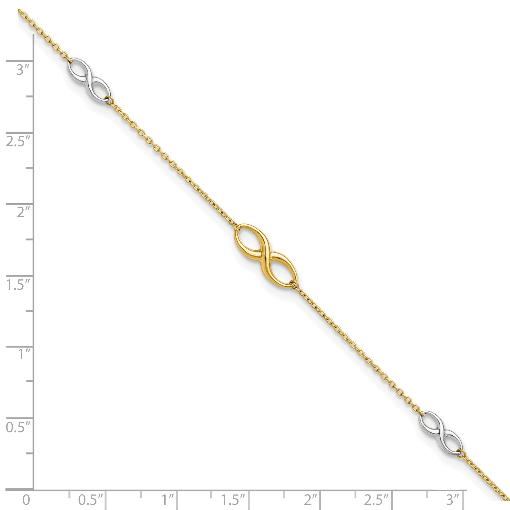 Introducing the 10K Two-Tone Polished Anklet with a 1-inch Extension. This elegant piece features a blend of 10K gold and rhodium plating, creating a sleek two-tone look. The anklet measures 9 inches, with a cable chain that's 0.8 mm wide and an additional 1-inch extender for a perfect fit. The lobster clasp adds a fancy detail, ensuring secure wear. Each anklet also comes with a lifetime guarantee, showcasing its exceptional quality. Ideal for women who appreciate fine jewelry, the 10K Two-Tone Polished Anklet is a must-have addition to any collection.