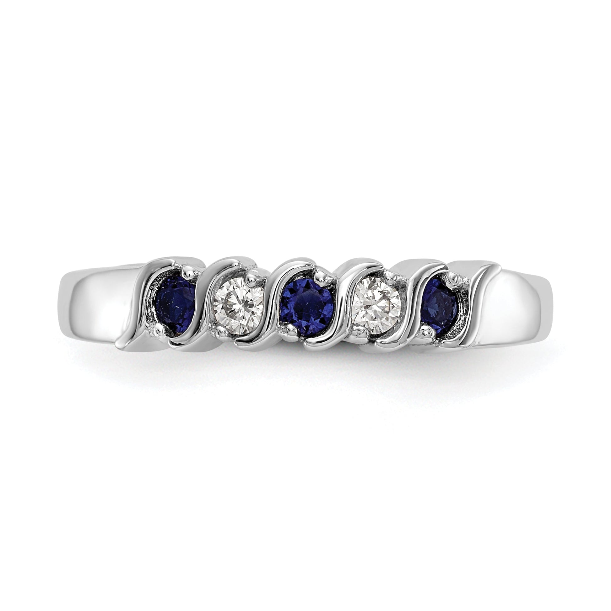 The 10K White Gold Diamond with Sapphire Band is a stunning piece of fine jewelry that blends elegance with simplicity. Crafted in 10K white gold, this band features two natural round diamonds and three natural sapphires that sparkle with every turn of your hand. The diamonds and sapphires, each weighing 0.045 carats, are set in a polished rhodium-plated band, offering a classy and clean look. Available in sizes 6 to 8, the ring's tapered design ensures a comfortable fit. Perfect for any occasion, the 10K White Gold Diamond with Sapphire Band adds a touch of sophistication to your collection.