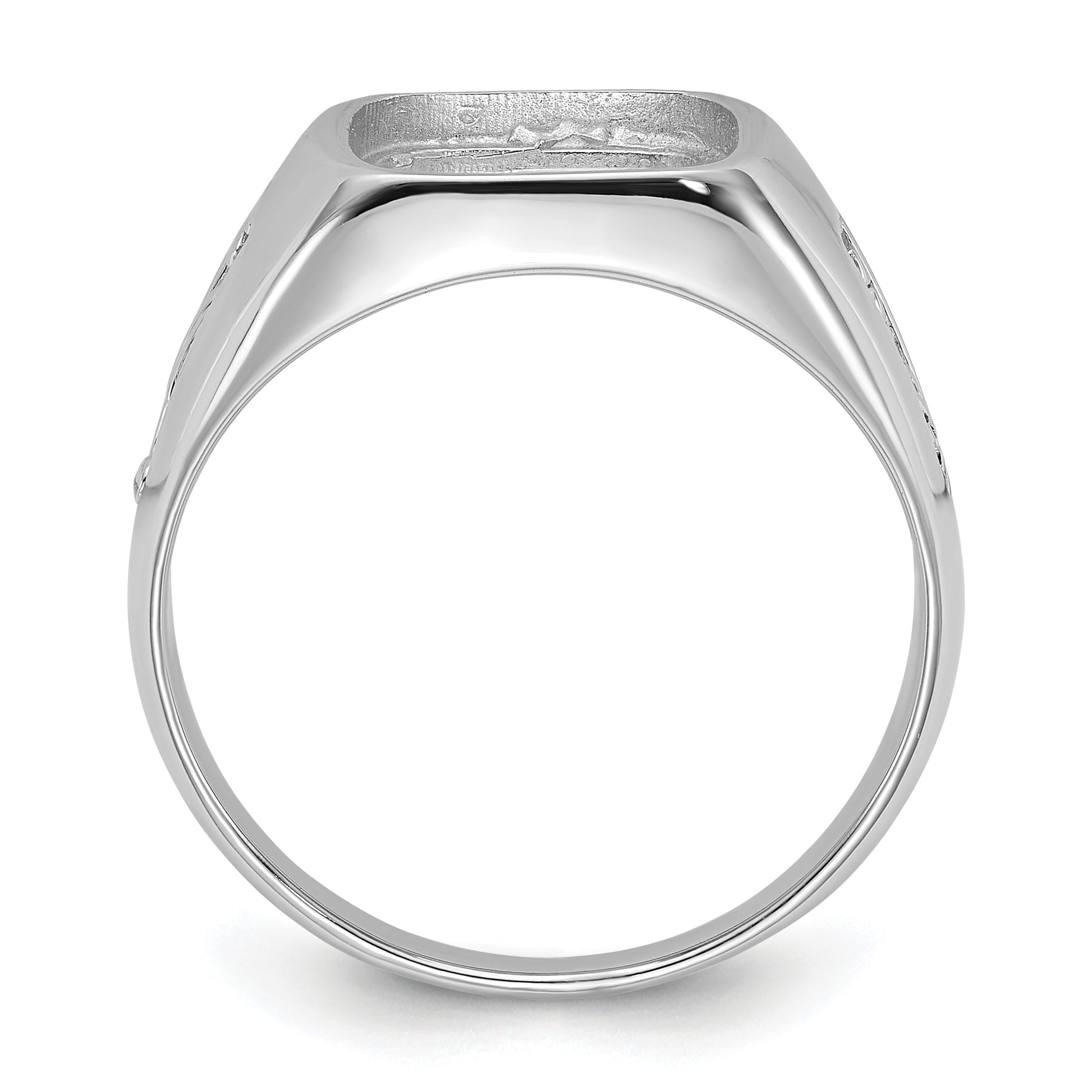 The 10K White Gold Men's Polished and Grooved Masonic Ring is a striking piece for the modern man. Crafted with 10K white gold and polished to a brilliant shine, this ring showcases elegance. Its rhodium plating adds a touch of sophistication, while the grooved design gives it a unique edge. The ring features a tapered band, making it suitable for all-day wear. With an open back profile, it's designed to mount a stunning stone of your choice, offering room for personal expression. It’s not just a ring; it’s a statement.