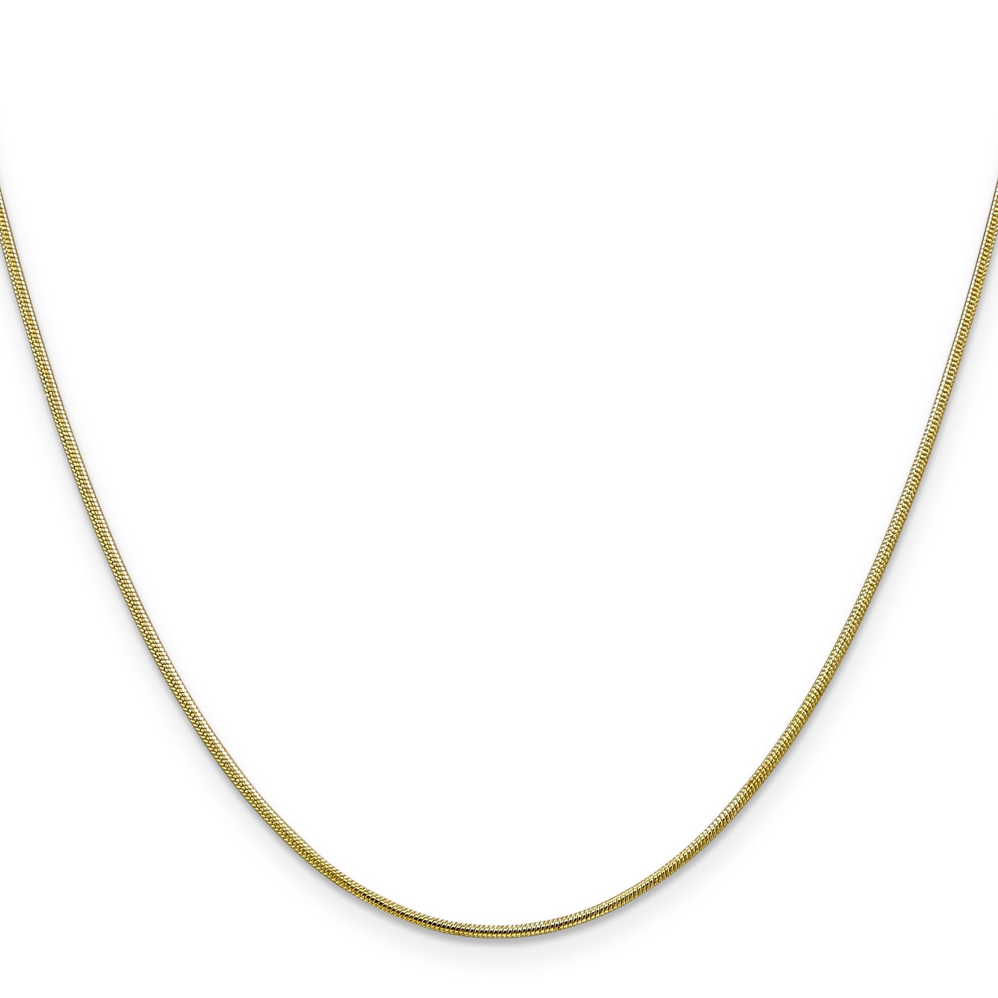 The 10K Yellow Gold 1.1mm Round Snake Chain is a sleek and elegant addition to your jewelry collection. Crafted from pure 10K gold, this snake chain shimmers with a polished finish, capturing attention effortlessly. Its slender 1.1mm width adds a sophisticated touch, while the solid construction ensures lasting durability. At 20 inches in length, it sits gracefully around the neck, held securely by a lobster clasp. This piece is made through a meticulous die-struck and extruded process, ensuring high-quality craftsmanship. Elevate your look with the timeless allure of the 10K Yellow Gold 1.1mm Round Snake Chain.